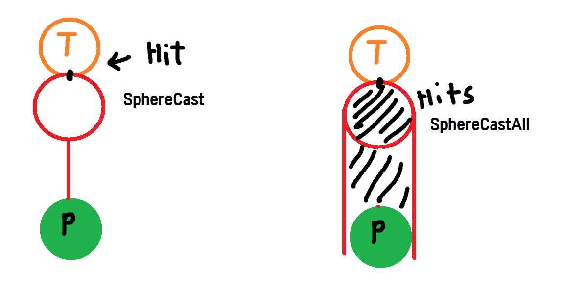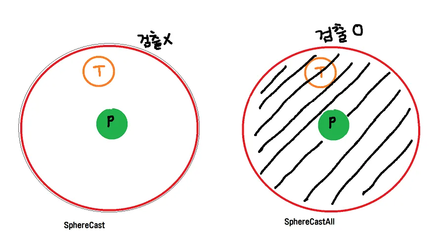 SphereCast는 내부를 검사하지 않고 Sphere 테두리에 닿은 부분만 검출한다.