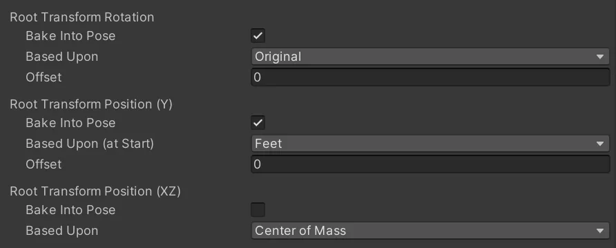 간략하게 살펴보면 Bake Into Pose 경우 애니메이션의 값을 적용할지 아님 고정할지에 대한 것이며