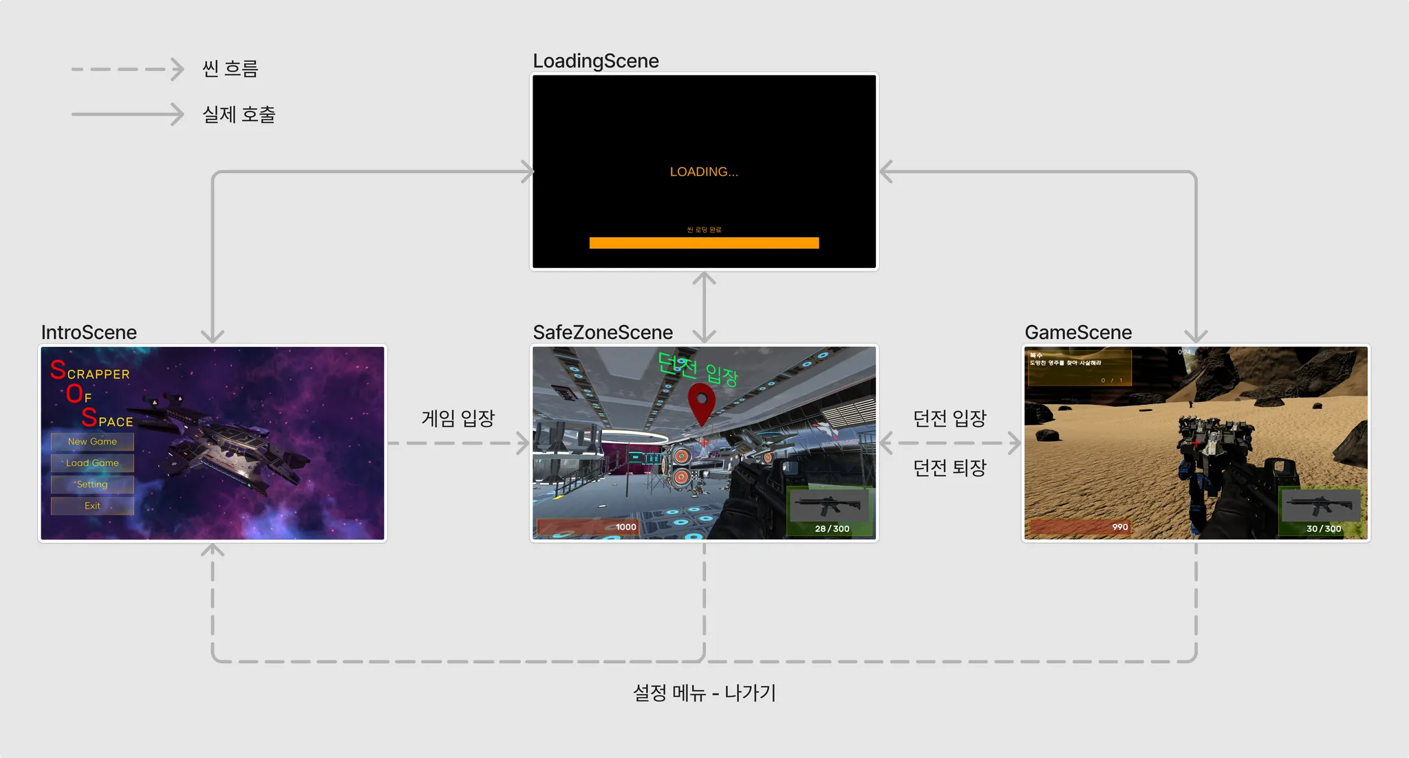 모든 씬들은 로딩씬을 통해 불필요한 데이터들을 정리하고 다음 씬으로 넘어갑니다.