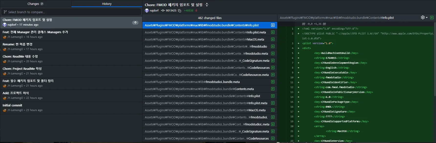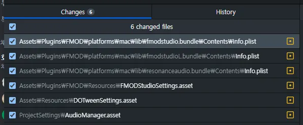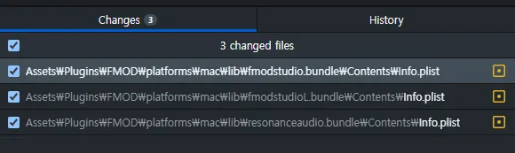 문제 : FMod 세팅 후, Change목록에 FMod 관련 세 개의 파일이 재작성됨을 확인