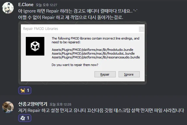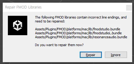 Repair를 한 것이 새 파일 작성으로 이어짐. 단 Ignore를 한 경우, 이후 FMod가 제대로 작동할지는 미지수.