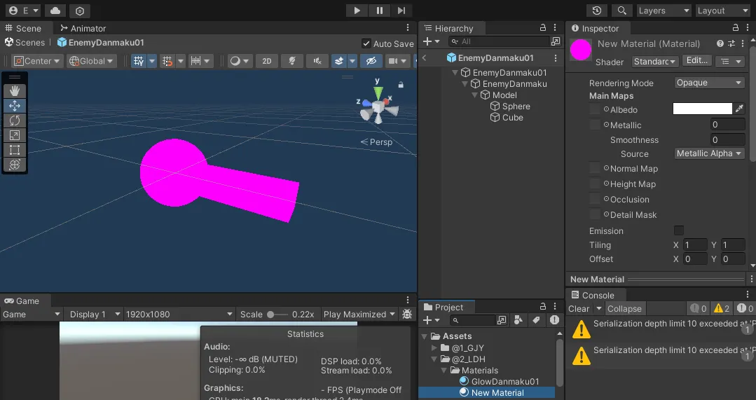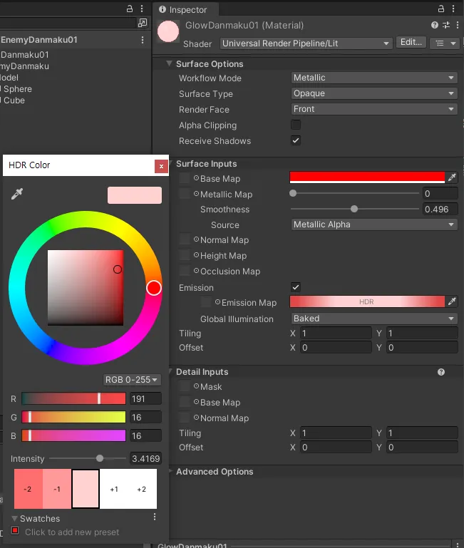 탄막의 구형 오브젝트와, 궤적Trail에 같은 색과 Emittion의 머테리얼을 사용하였다. 같은 머테리얼을 사용해도 되기는 하지만, 일단 파일 자체는 분리 해 놓은 상태.