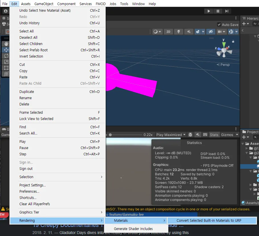 머테리얼을 URP용으로 수정 해 주어야 한다.