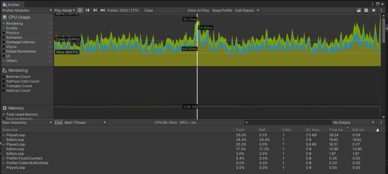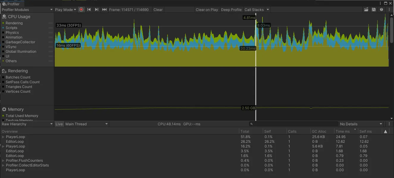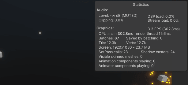 배치수가 계속 오르는 걸 보면, GPU인스턴싱이나 오브젝트들의 재사용이 사실상 안 되고 있는 것 같고, Shadow casters도 지금 사용하는 오브젝트만큼 계속 증가하는 걸 보면 탄막 하나 당 그림자를 모두 사용하는 것으로 보인다. 그래서 그래픽적인 최적화를 먼저 시도해보는 게 좋을 것.
