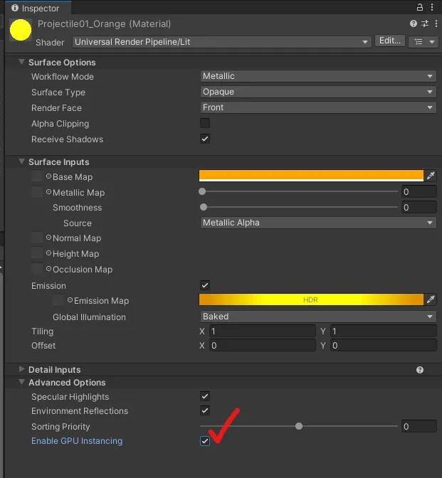 아래와 같이 탄막 및 Trail에 사용된 여섯개의 머테리얼에서 GPU Instancing을 체크한다.