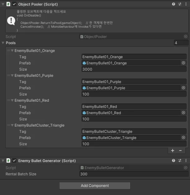 탄막이 Velocity(Rigidbody)를 통해 움직이고 있어 이전에 대여 및 반납되었던 탄막을 다시 대여할 경우 의도치 않은 결과가 발생하여, 반환하는 메서드에 앞서 초기화 작업을 하는 스크립트를 추가 해 주었다.