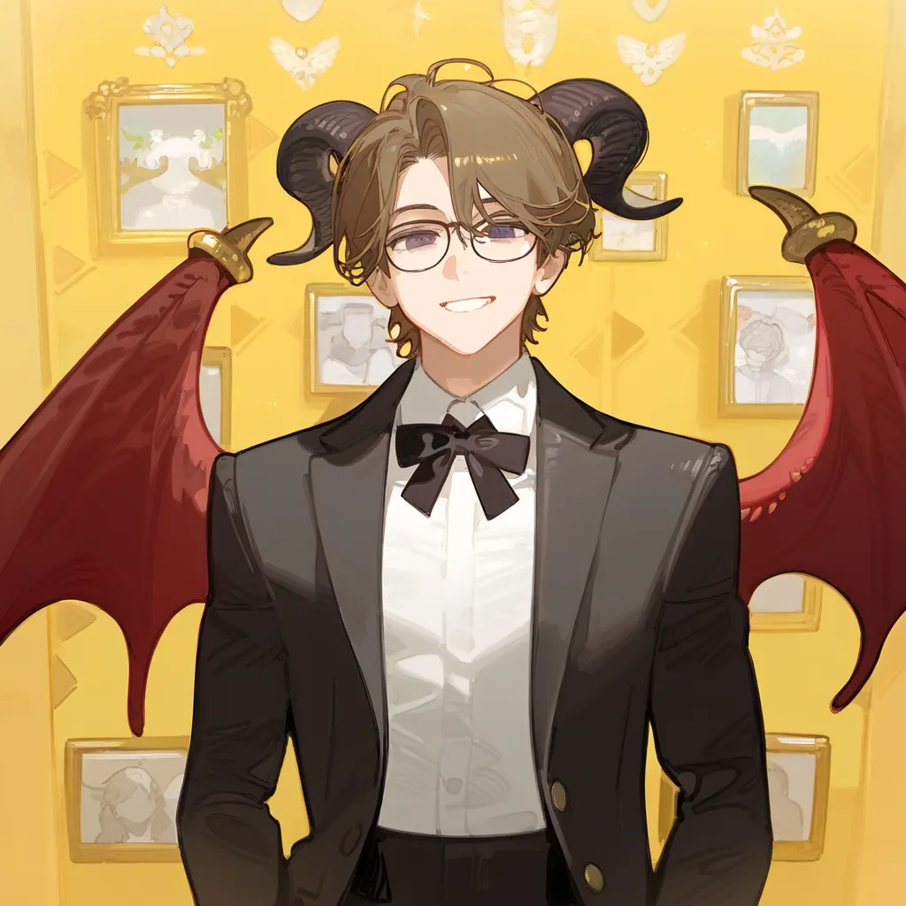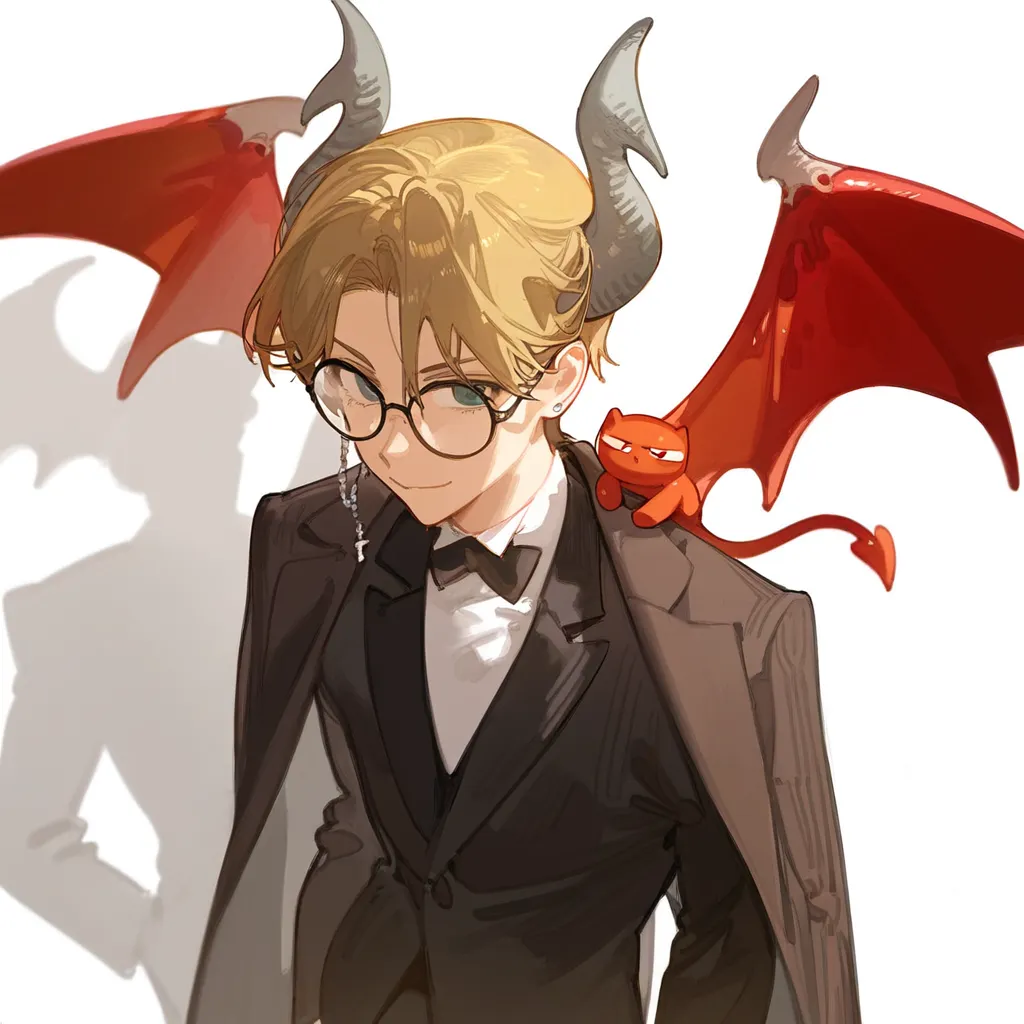 masterpiece, best quality, high quality, {{{{{one man}}}}}, {{{{{one boy}}}}}, [[mx2j]], {{{ame (uten_cancel)}}}, {{{[artist:ciloranko]}}}, {{{artist:ask (askzy)}}}, {{{artist:freng}}}, {{{artist: rella}}}, {{{year 2023}}}, red wings, horn, eye glasses,