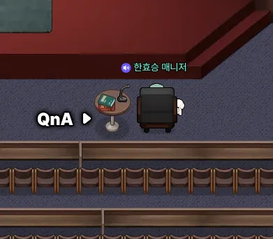 사진속의 QnA 의자에 캐릭터가 앉으면 마이크 음성이 해당 발표장 전체에 들려 발표자에게 보다 쉽게 질문하실 수 있습니다.