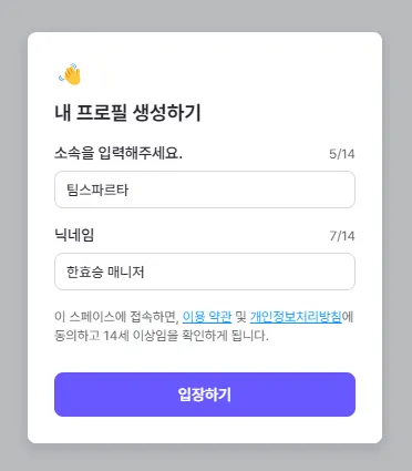 최초 접속 시 보여질 소속과 이름을 적을 수 있습니다.