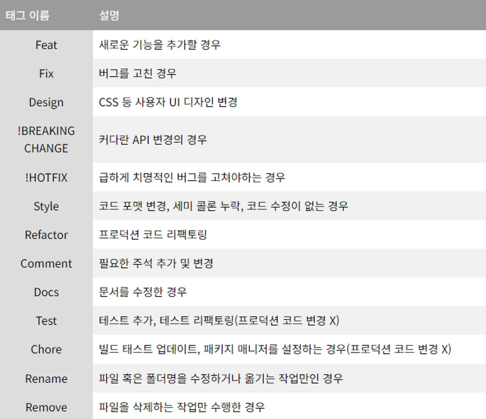 Feat / Fix / Rename / Remove 만 쓰도록 한다.